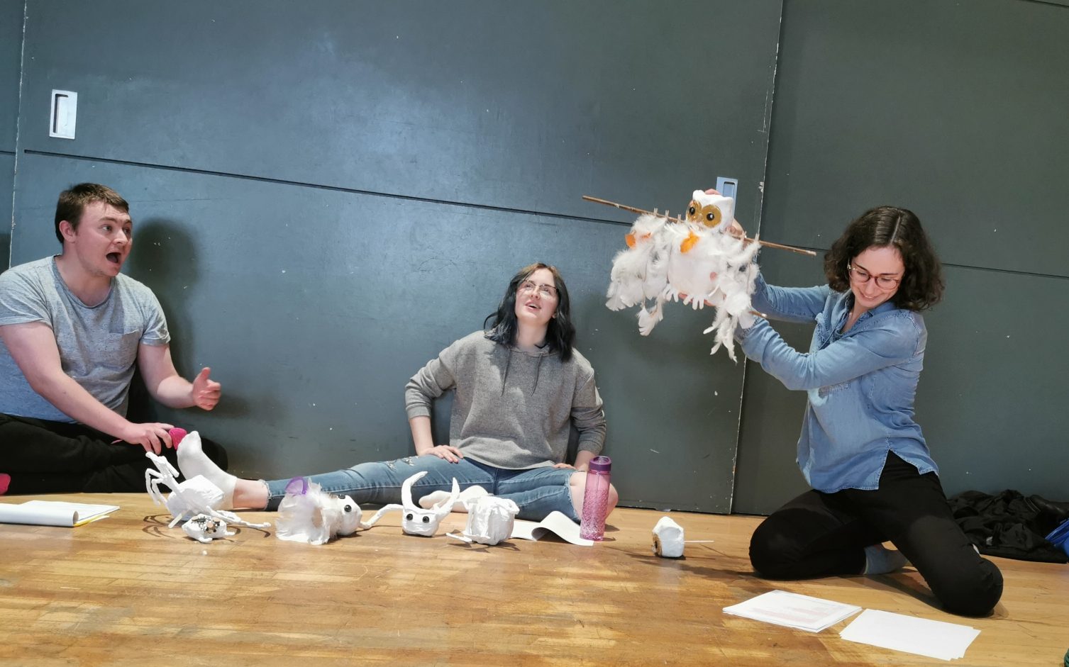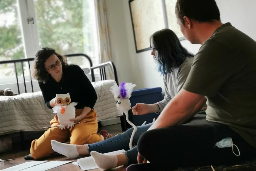 Alina Ben-Larbi (manipulating the owl in pictures), John Tulloch (the pine), and Heather MacDonald (the thistle) performed the three narrators in the work-in-progress event.